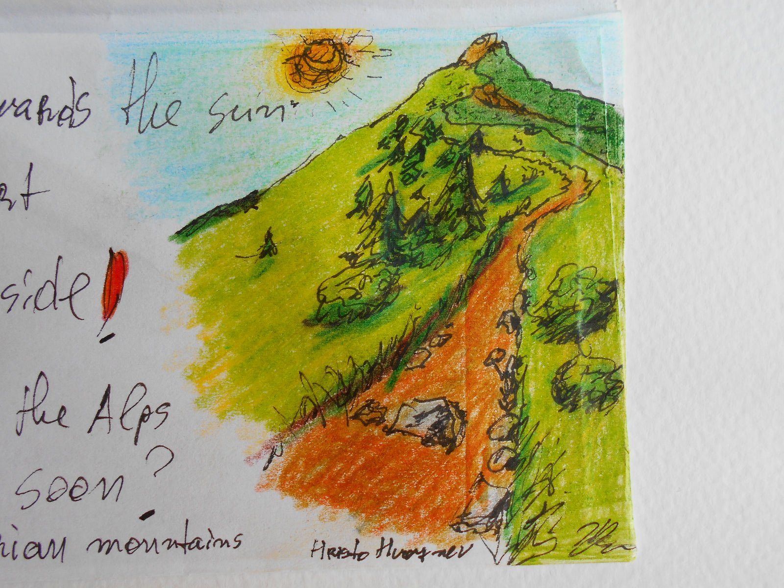 Original black ink and colored pencils artwork of an oak tree and a mountain landscape by Hristo Hvoynev from Bulgaria